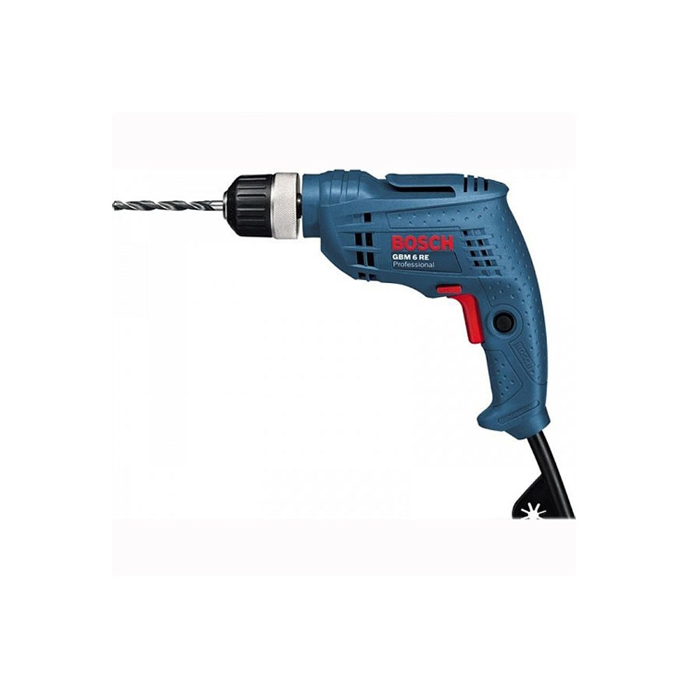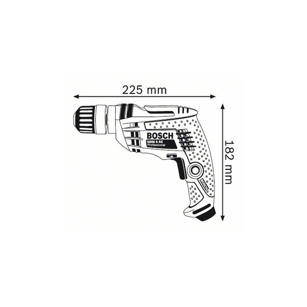 Дрель BOSCH GBM 6 RE - безударный инструмент для уверенного сверления отверстий в металлических и деревянных заготовках, древесных панелях, пластике, минеральных стройматериалах. Она может проделывать в стали отверстия диаметром до 6.5 мм, в алюминиевых листах и профиле - до 8 мм, в древесине - до 15 мм. Быстрозажимной патрон данной модели предполагает установку оснастки с цилиндрическим хвостовиком диаметром 1-10 мм. Максимальная скорость вращения шпинделя дрели составляет 4000 об/мин. Редуктор сетевой дрели BOSCH GBM 6 RE снабжен реверсом для легкого извлечения заклинившей оснастки, выкручивания крепежа. Инструмент получил систему плавной регулировки оборотов и электронную защиту от перегрузки. Он получает питание от однофазной бытовой сети с напряжением 220 В, подключаясь к ней при помощи 2.5-метрового сетевого шнура. Имея вес в пределах 1.2 кг, дрель не утомляет руки оператора даже при продолжительной работе.