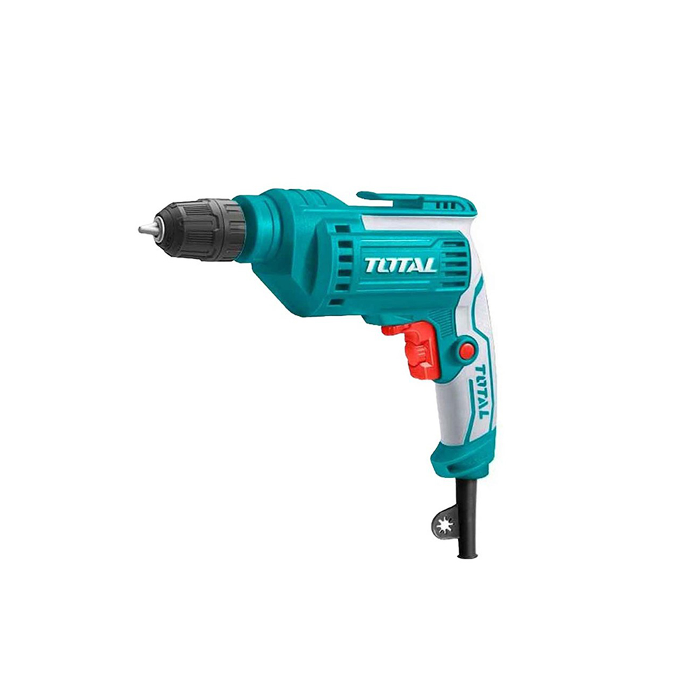 Электрическая дрель TOTAL TD2051026. Оснащена ключевым патроном, который более надежен при работе с твердыми материалами. Фиксация выключателя во включенном положении обеспечивает удобство при продолжительной работе . У основания провода предусмотрено специальное крепление для хранения патронного ключа или запасных сверл/бит . Данная информация скопирована со страницы: https://www.vseinstrumenti.ru/instrument/dreli/bezudarnye/total/elektricheskaya-td2051026/