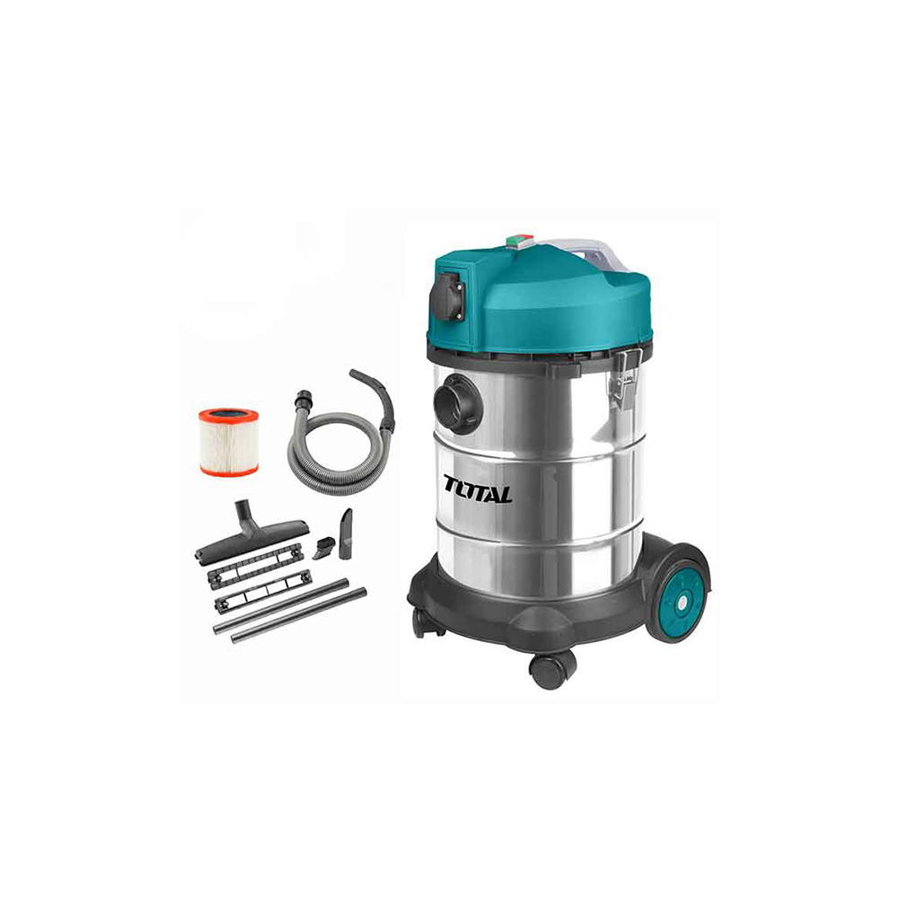 Пылесос промышленный TOTAL TVC14301. Преимущества: пылесборник на 30 литров без мешка, из нержавеющей стали. патрубок для слива жидкости. удобная система перевертывания для опустошения пылесборника. пылесос на колесиках, для удобного передвижения. все дополнительные щетки и насадки крепятся на самом пылесосе. двигатель 1400W Материал бака: нержавеющая сталь Кабель: 5m