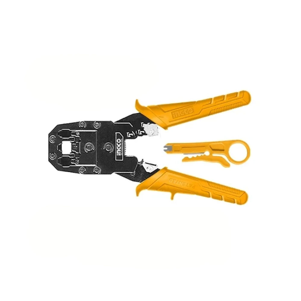 Клещи для обжима витой пары INGCO HMPC1468P предназначен для перекусывания или обжима кабелей и проводов для подключения компьютеров или телефонов и имеют типоразмер 4Р/6Р/8Р, RJ-45, RJ-11, RJ-12. Корпус обработан воронением и выполнен из высокопрочной закаленной инструментальной стали с возвратным механизмом для обеспечения обратного хода рукояток. Уникальный дизайн рукояток из ударопрочного ABS пластика, что обеспечивает комфортное применение. Пружина для разжимания рукояток облегчает продолжительную работу. В комплекте поставляется инструмент для заделки и зачистки витой пары.