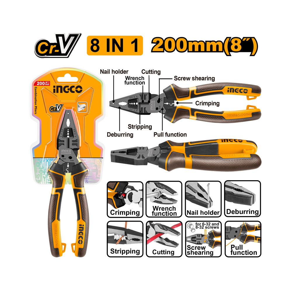 «Многофункциональные комбинированные плоскогубцы 8-в-1 » – Размер: 8 дюймов/200 мм – Материал: Cr-V – Обработка поверхности: тефлоновое покрытие – Многоцелевая конструкция позволяет выполнять больше задач с помощью одного инструмента – TPR 3 Цветная ручка для надежного захвата и комфорта – упакована в двойной двойной блистер».