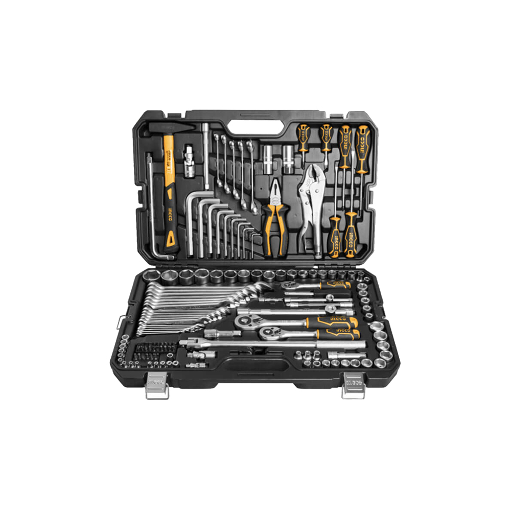 Набор инструмента универсальный INDUSTRIAL включает в себя 142 предмета. Размер 1/2": 19 шестигранных головок: 8, 10, 12, 13, 14, 15, 16, 17, 18, 19, 20, 21, 22, 23, 24, 25, 27, 30, 32 мм, 5 звездообразных головок (Е профиль): 10, 12, 14, 16, 20 мм, трещотка 1/2" 45T, 2 удлинителя: 75 мм, 250 мм, шарнир карданный, 2 свечные головки: 16 мм, 21 мм, переходник с отверстием 3/8" на 1/2", вороток с шарниром, вороток Г-образный. Размер 3/8": 15 головок: 6, 7, 8, 9, 10, 11, 12, 13, 14, 15, 17, 18, 19, 21, 22 мм, трещотка 3/8" 45Т, 2 удлинителя: 75 и 150 мм, шарнир карданный. Размер 1/4": 26 бит длиной 25 мм: PH0, PH1, PH2, PH3,PZ0, PZ1, PZ2, PZ3, SL4, SL5.5, SL7, H2, H3, H4, H5, H6, H7, H8, H10, биты с внутренним отверстием T10H, T15H, T20H, T25H, T27H, T30H, T40H, держатель бит, 9 шестигранных головок: 4, 4.5, 5, 5.5, 6, 7, 8, 9, 10 мм, 5 звездообразных головок (Е профиль): 4, 5, 6, 7, 8 мм, трещетка 1/4" 45Т, 3 удлинителя: 50, 100, 150 мм, шарнир карданный, переходник с отверстием 3/8" на 1/4", вороток отверточный, гибкий удлинитель 150 мм.