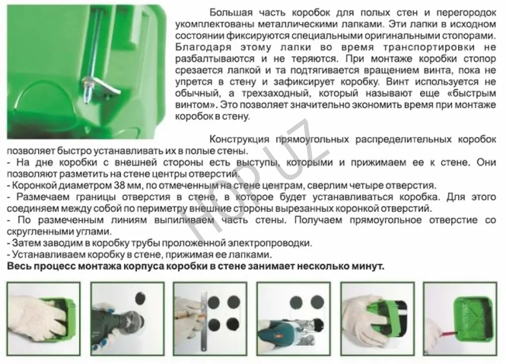 все коробки, имеющие металлические лапки, комплектуются трехзаходными винтами, позволяя сократить время монтажа в стену.