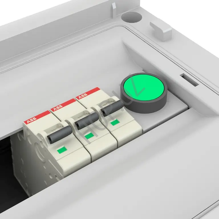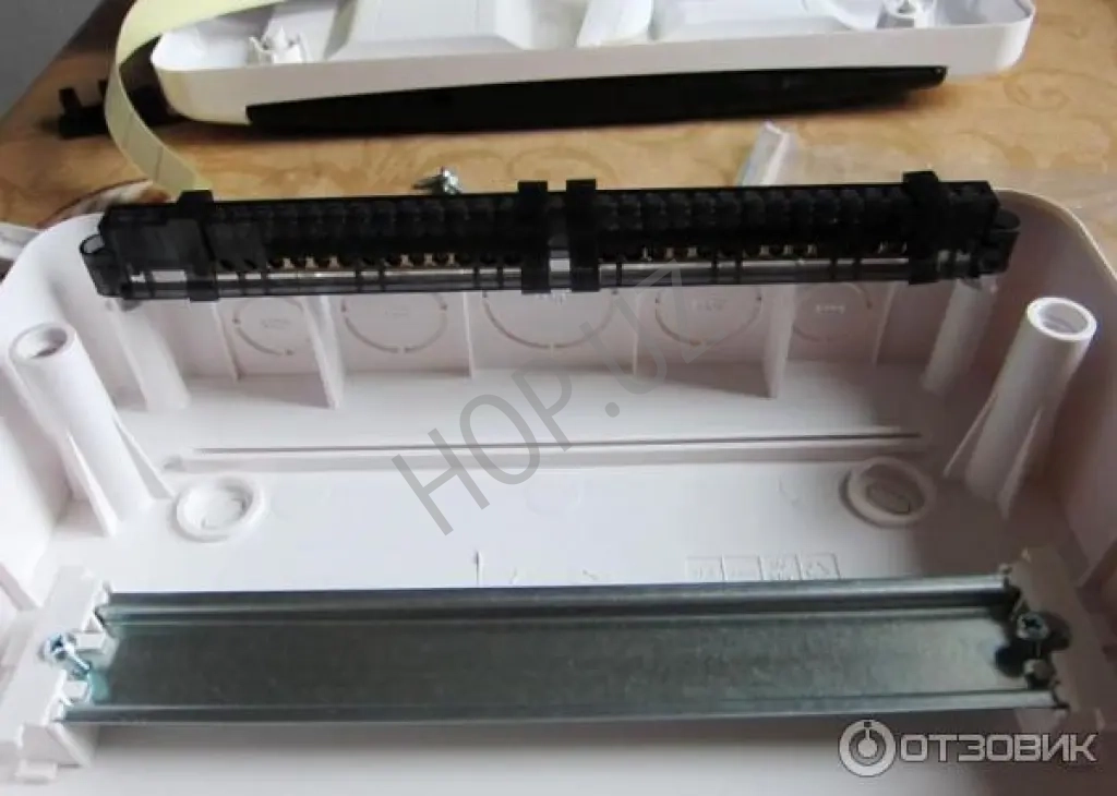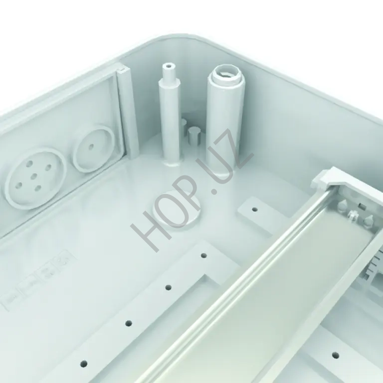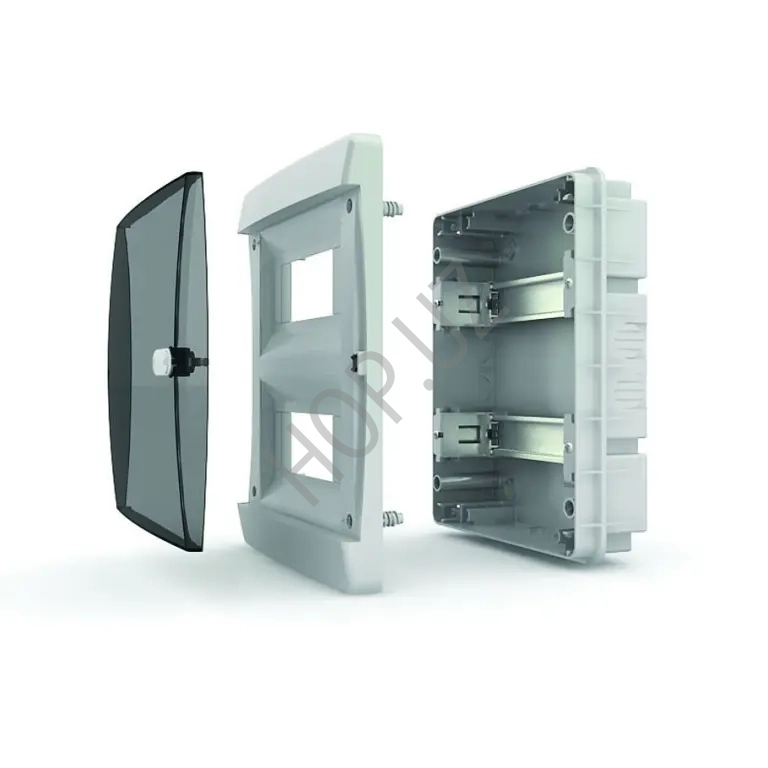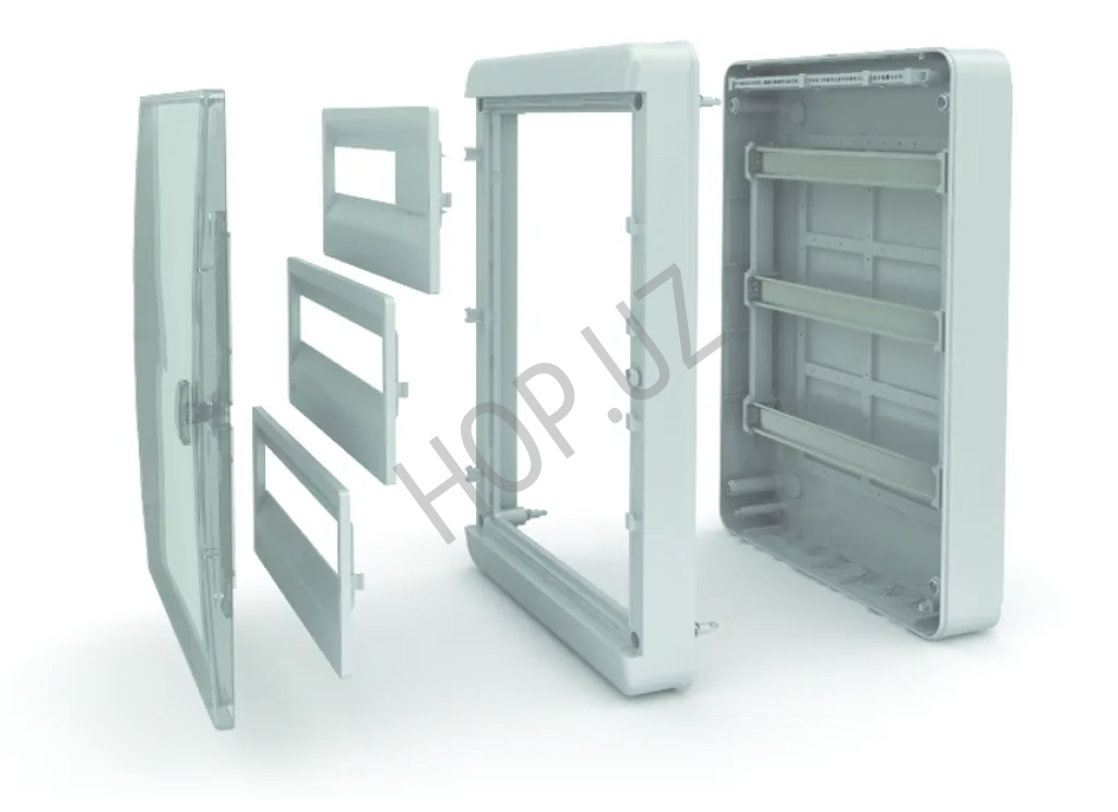 - на днище и боковых сторонах имеются выдавливаемые отверстия — крышка щита имеет выдавливаемые элементы, для изменения числа устанавливаемых модулей