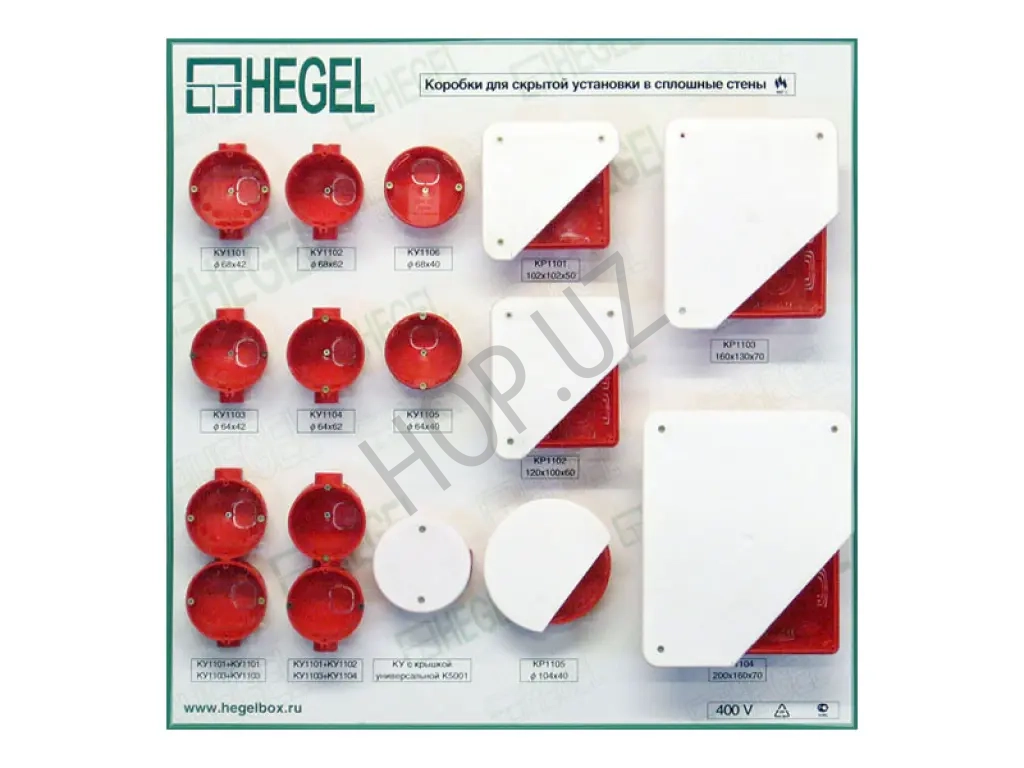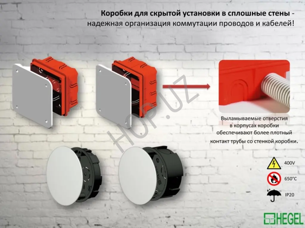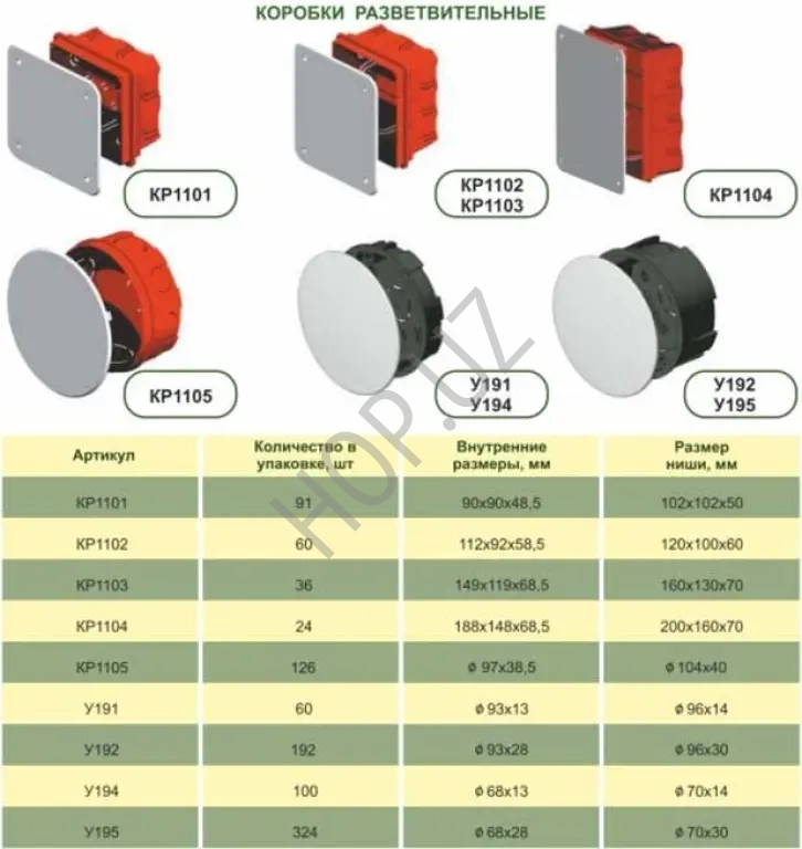 Разветвительные коробки КР скрытой установки служат для организации коммутации проводов и кабелей и укомплектованы крышками, которые крепятся на самонарезающих винтах. Внутри коробок на дне находятся направляющие, позволяющие при помощи самонарезающих винтов устанавливать клеммники, рейки, платы и другие изделия.